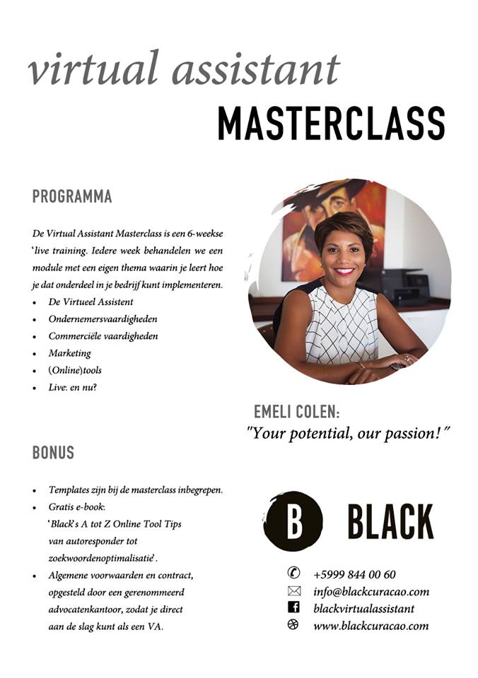 Emeli Colen is een administratieve en secretariële duizendpoot met een passie voor marketing en de oprichter van BLACK. Ze is geboren op Curaçao en is op jonge leeftijd naar Nederland verhuisd. Daar heeft ze ruim 12 jaar als secretaresse gewerkt en een affiniteit voor marketing ontwikkeld. Via de Academie voor Virtueel Assistenten heeft ze nieuwe werkwijzen, (online) tools en technieken op het gebied van virtuele assistentie eigen gemaakt. Haar passie voor marketing en een persoonlijke interesse in het uit handen nemen van werk bij mensen, leidde in april 2014 tot een nieuwe uitdaging als zelfstandig ondernemer in haar geboorteland Curaçao. Vanuit haar thuiskantoor vertaalt Emeli haar kennis en praktijkervaring in werkbare oplossingen voor ondernemers. Via BLACK hoopt ze bij te dragen aan een flexibelere en efficiëntere bedrijfsvoering op Curaçao.