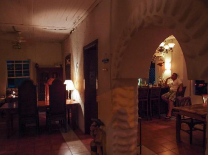 Tussen villapark Fontein en Kas Abou strand ligt op een hoek rechts dit restaurant; buiten is een terras van houten tafels met houten banken en daar zitten we dan. Binnen zitten kan wel, maar ja, wie zou dat op Curacao doen? E Lanternu is een restaurant van Eetcafé-kwaliteit: daar is niks mis mee, zeker niet omdat ook de prijzen daarop zijn afgestemd. En de bediening is supervriendelijk, dus wat wil je nog meer. Bij de hoofdgerechten kiezen uit patat, rijst of gebakken aardappeltjes. De wijn komt in duralex-glazen. Kortom, geen pretenties, gewoon lekker eten in de tuin.
