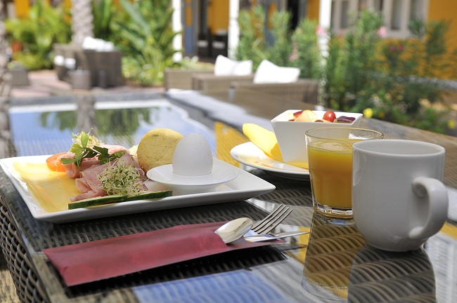 Dagelijks kunt u op de binnenplaats van 07.00 tot 10.00 uur ontbijten. Kosten ontbijtbuffet; $15.- p.p. U kunt hier ook gebruik van maken als u niet in het hotel verblijft.