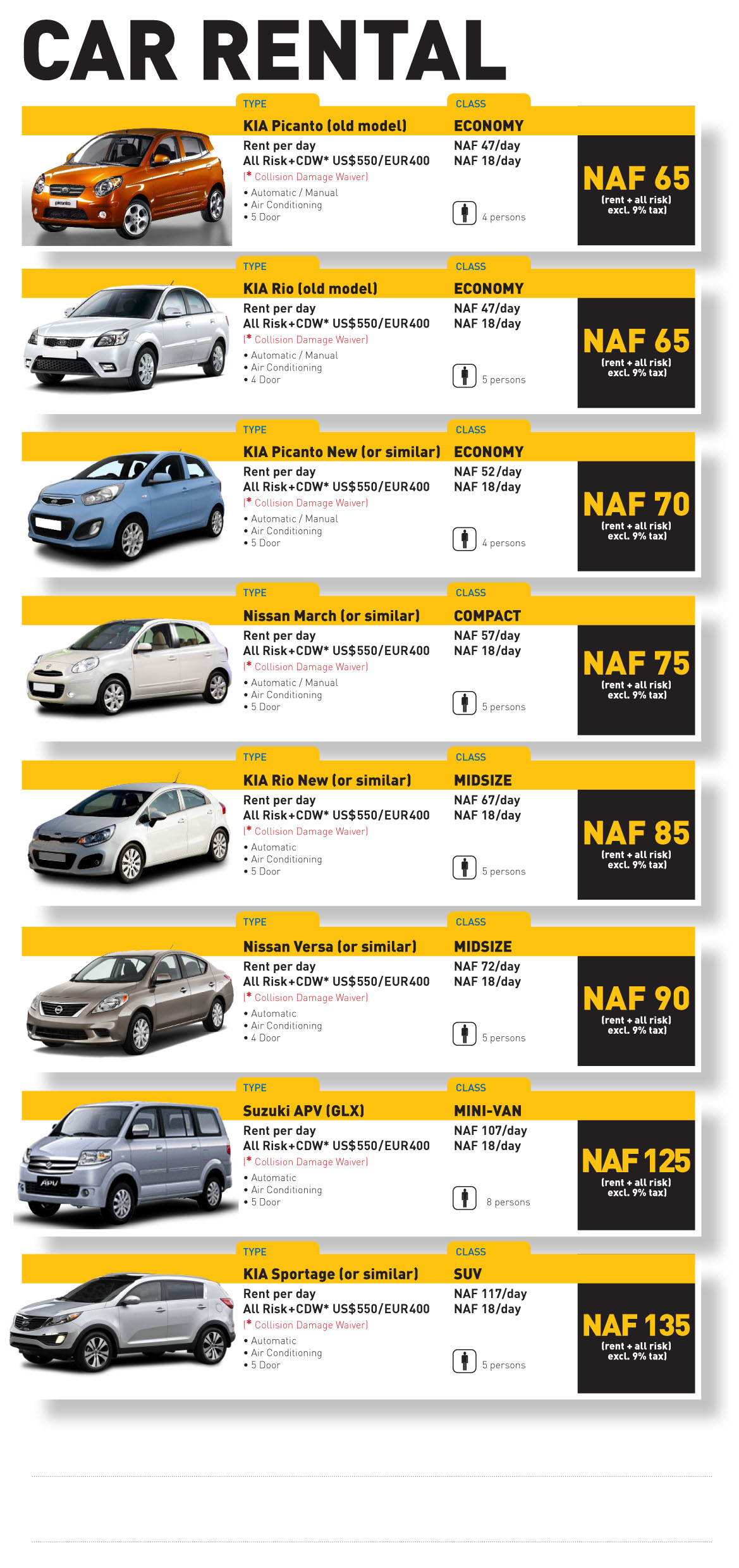 from economic cars to suv cars. We have about 50 rental cars. Our prices start from fl. 55 per day, including all risk insurance, free milage, free extra driver, free pickup & delivery. Go to our website for detailed information about the cars and our prices. You can contact us through our reservation form on the website. We have a 99% availability rate, so get in touch now! www.platinacarrentalcuracao.com