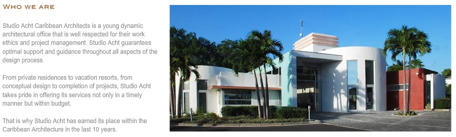 Studio Acht Caribbean Architects is a young dynamic architectural office that is well respected for their work ethics and project management. Studio Acht guarantees optimal support and guidance throughout all aspects of the design process.